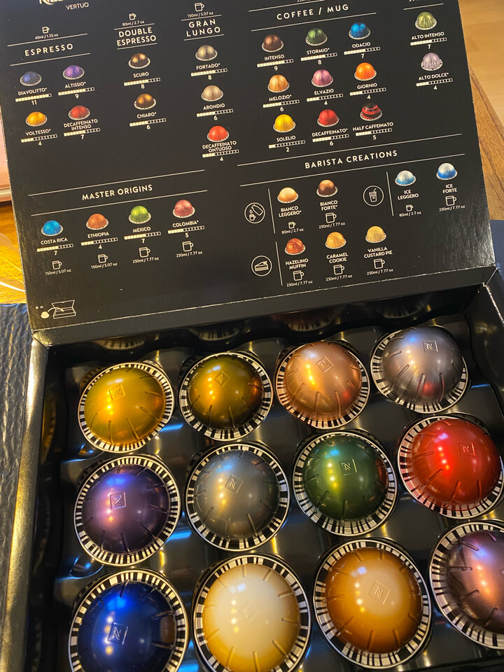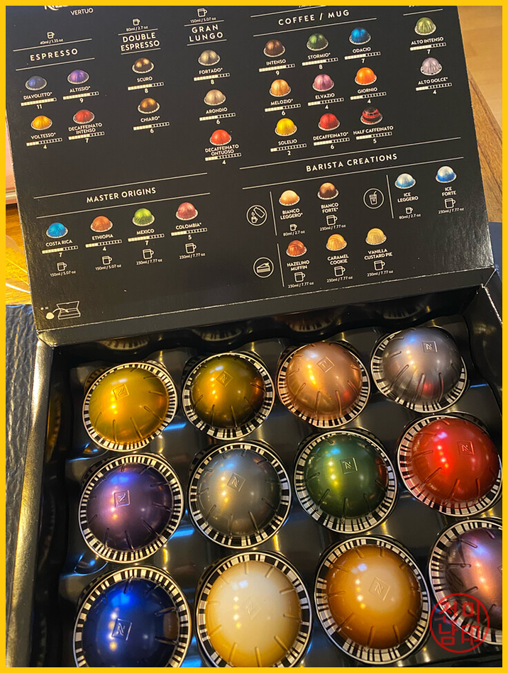 캡슐종류가 38개나 있어서, 고르고 골라서 내입맛 저격 캡슐 몇개 찾았음.!!!! 본인은 평소에 얼죽아파고 디카페인 안먹는데 버츄오로 처음 (알티시오 디카페나토)마셔 봤는데 헉 뭐야 디카페인이 이렇게 맛있는 건가? 그래서 디카페나토 40개 담았음! 이거 왜이렇게 맛있는지 밤에는 이것만 마실 생각임.. 디카페인이라고 커피맛 차이 못느낌 그냥 커피같음ㅠㅠ!